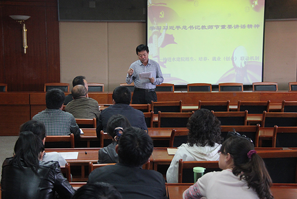 2014年9月25日下午,学院分党委组织全院教职工在502会议室召开集中学习会。会上,分党委书记陆海平传达了学习习近平总书记9月9日与北京师范大学师生代表座谈时重要讲话精神。习近平总书记的重要讲话内涵丰富、思想深邃,语重心长、情真意切,深刻阐释了教育工作和教师工作的极端重要性,充分体现了党中央对广大教师的亲切关怀和对教师成长的殷切期望,是新时期教师教育工作的纲领性文献,是进一步加强教师工作的行动指南。学习好、领会好、贯彻好、落实好讲话精神,对于全面提升教师队伍质量和水平,落实立德树人根本任务,深化教育领域综合改革,加快推进教育现代化,具有重大而深远的意义。分党委要求每一位教师深刻领会习近平总书记重要讲话精神,牢记总书记嘱托,把全部精力和满腔真情献给教育事业。要有理想信念,自觉肩负起国家使命和社会责任;要有道德情操,自觉带头践行社会主义核心价值观;要有扎实学识,自觉刻苦钻研、严谨笃学;要有仁爱之心,自觉爱护、尊重、宽容学生,努力成为党和人民满意、学生喜欢敬佩的好老师。