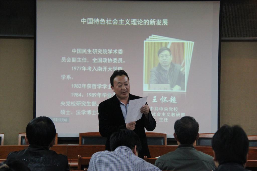 最后我院全体教职工党员一起观看并认真学习了由中共中央党校、科学社会主义教研部主任王怀超主讲的《中国特色社会主义理论的新发展》。
