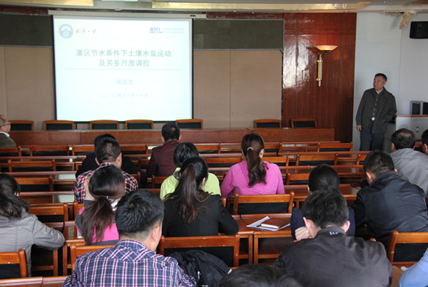 5月14日下午4:30,水建院邀请武汉大学水利水电学院的杨金忠教授在水利楼502座“灌区节水条件下土壤水盐运动及其多尺度调控”学术报告。全院教师、部分研究生100余人聆听了学术报告。