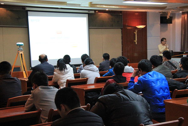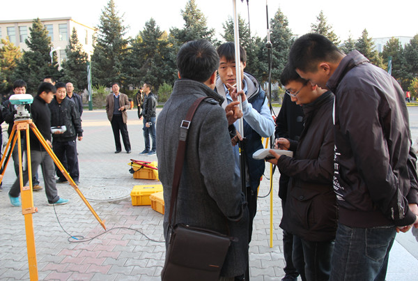 实践是最好的老师,首先技术员在水利楼前架设好仪器,为大家详细讲述新仪器的套组仪器,由卫星、地面接收器、发射器、移动测量设备组成,天空中的卫星将数据发射到地面的固定接收器,接收器再由电线或无线电将信号发射到发射器上,经发射器解算后发射到移动测量设备上,移动测量设备才得以方便快捷的测量。同学们聚拢在技术员的周围,积极认真的和技术员学习新型仪器的使用方法。随后,华测公司驻呼和浩特办事处宋经理向大家介绍了华测公司的现状以及和多所高校都有着良好的合作关系,并继续介绍了公司的雄厚实力,从公司的核心机构及其与各国的合作关系分析公司具有很好的发展前景。最后,王老师再一次对宋经理的到来表示热烈的欢迎,非常感谢宋经理能在百忙之中能抽出时间为同学们介绍新产品及其使用方法。