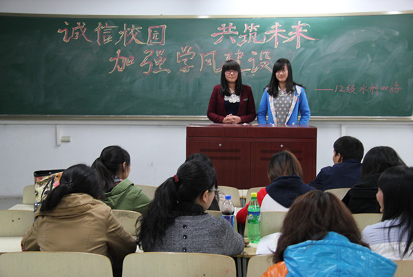 11月6日晚7:10,我院12级水利双语一、二班在新教学楼216开展主题为“诚信校园 共筑未来 加强学风建设”的团日活动。水利双语一、二班全体同学参加了本次活动。