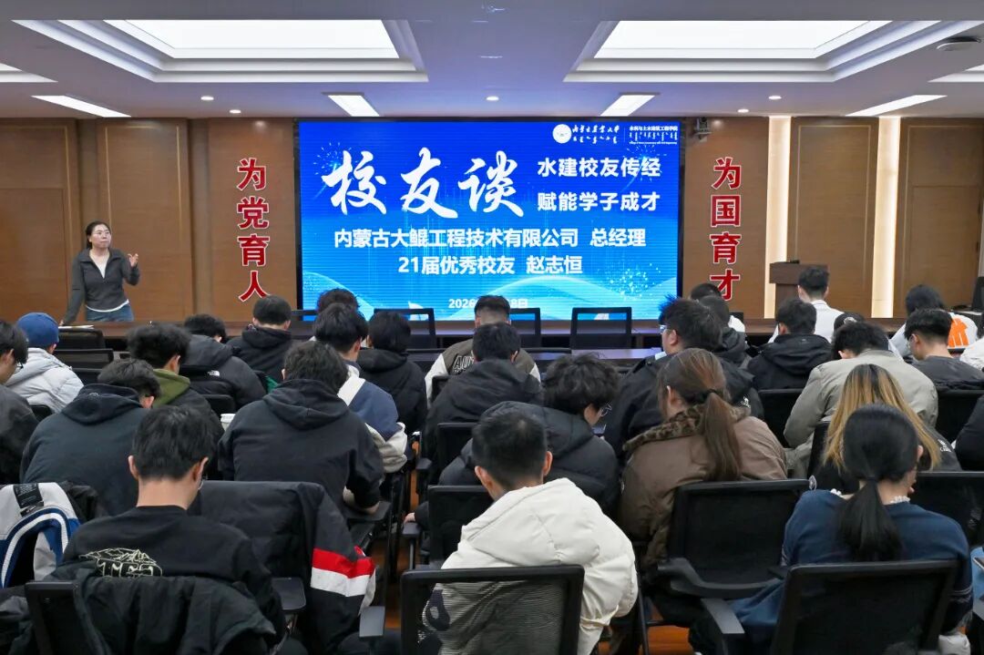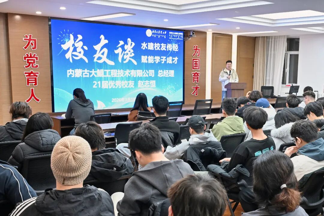 为助力我院学子清晰职业定位、明确生涯规划,2026年3月18日,学院于水利楼502举办“校友谈”主题分享会。此次活动会特邀学院21届优秀校友、内蒙古大鲲工程技术有限公司总经理赵志恒担任主讲,学院辅导员三叶主持。